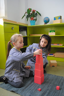 Con estos cubos, los niños hacen una torre, primero colocando en el suelo o en la alfombra, el cubo más grande y poniendo después sobre él todos los demás, por orden de tamaños hasta el más pequeño. Cuando ha construido la torre, el niño, la deshace, y entonces esparce los cubos sobre la alfombra, volviendo a empezar la construcción.