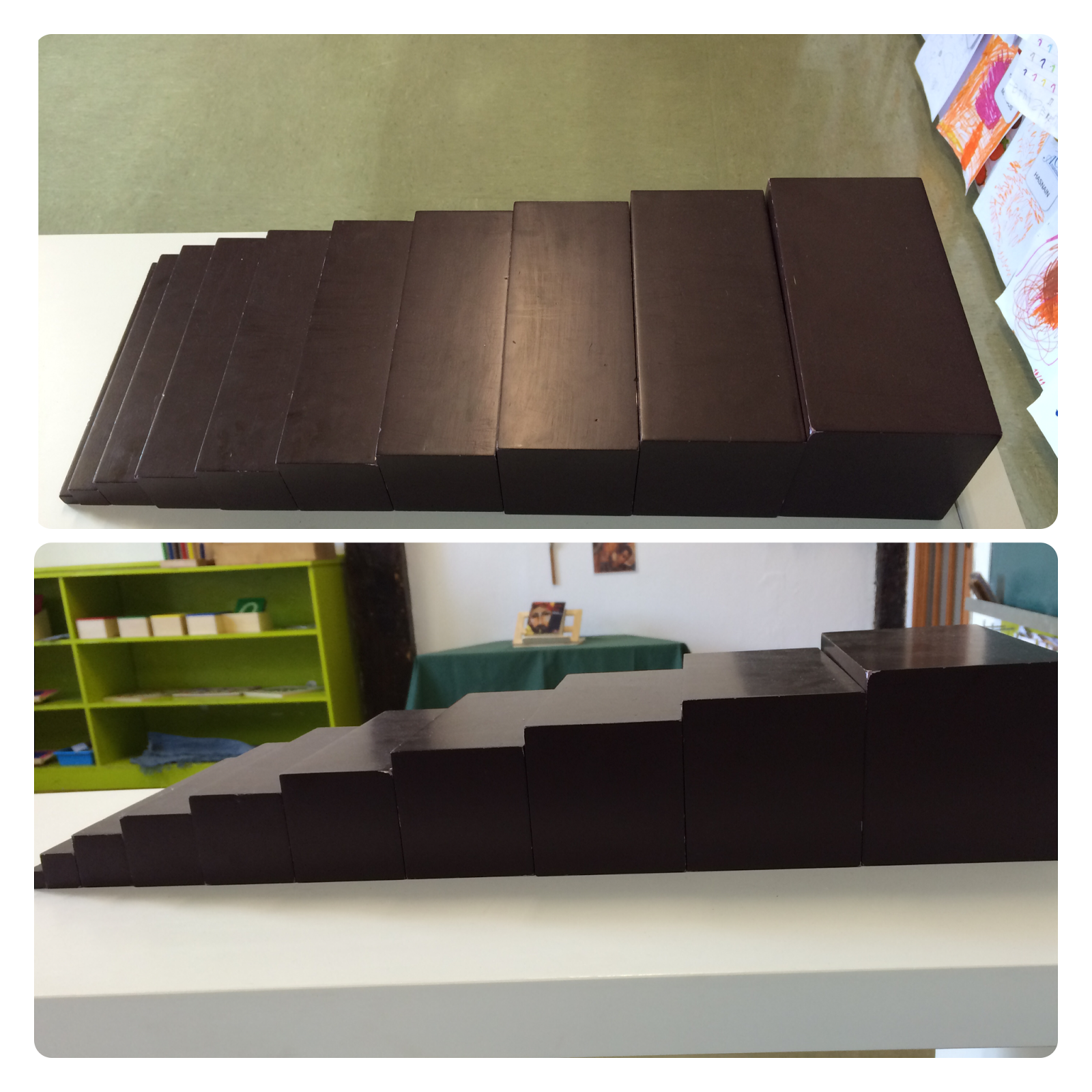 Continuando con la presentación de los materiales Montessori, otra de las series de formas geométricas sólidas, además de las barras rojas, es la escalera marrón.